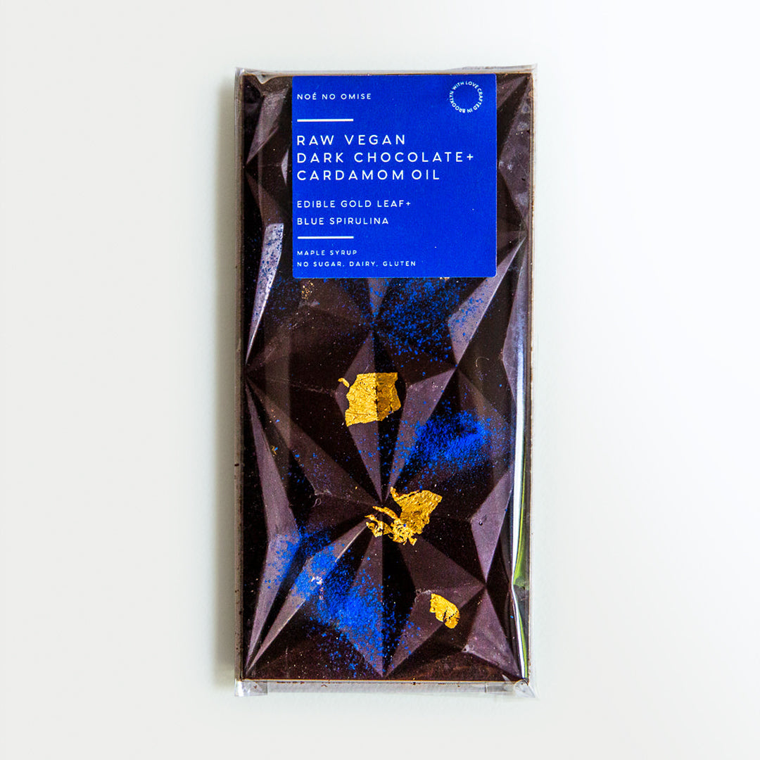 Made with simple ingredients: cacao butter, cacao powder, maple syrup, cardamom, salt, decorated with edible gold leaf, blue spirulina.