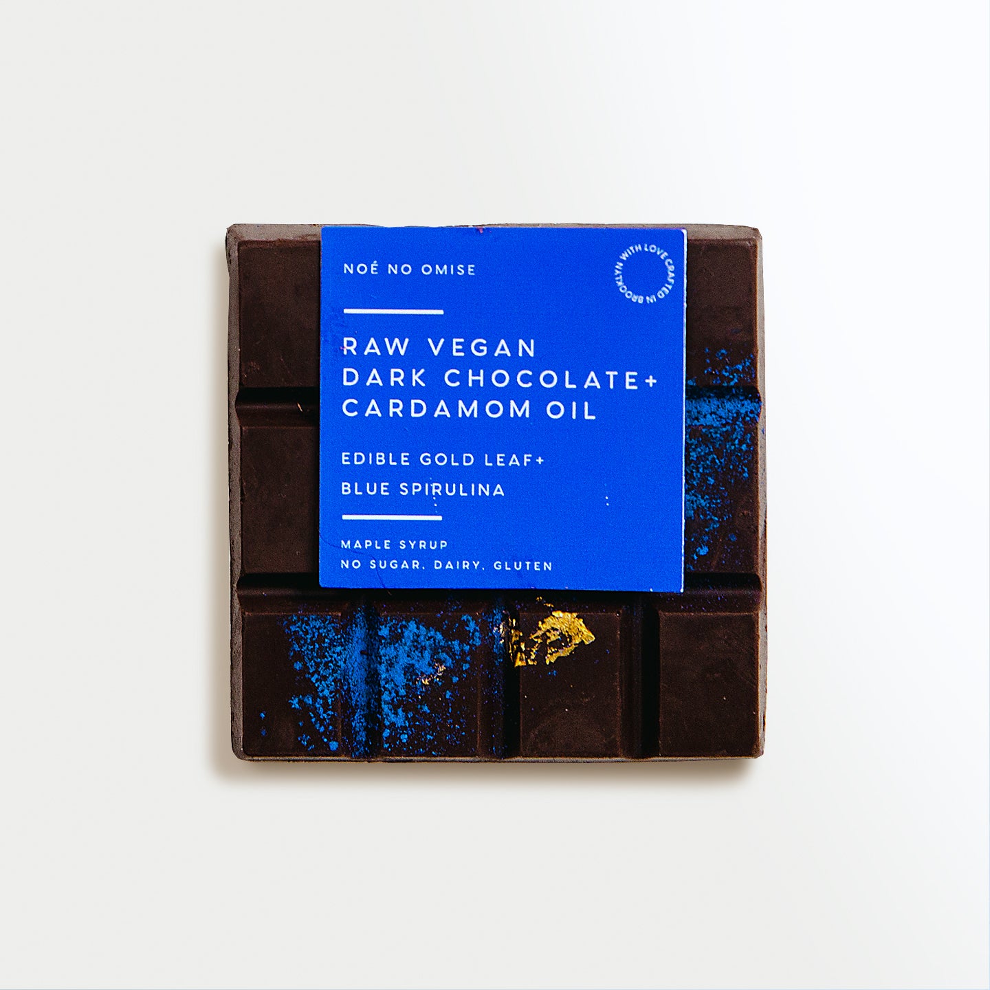 Made with simple ingredients: cacao butter, cacao powder, maple syrup, cardamom, salt, decorated with edible gold leaf, blue spirulina.