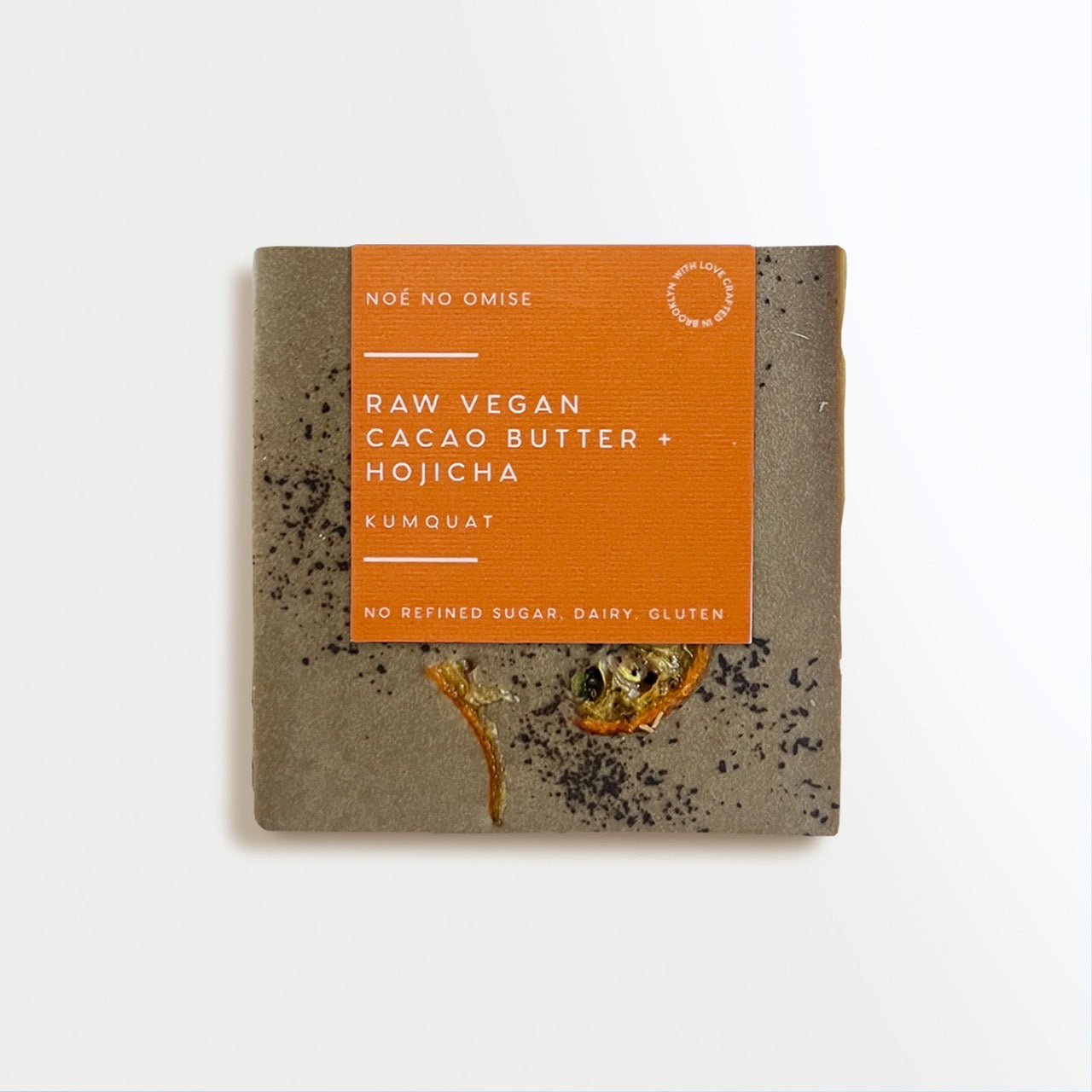 Made with pure ingredients: cacao butter, homemade roasted cashew butter, and Lakanto (monk fruit sweetener). Infused with hojicha (roasted green tea) for a subtle bitterness and a warm, toasty flavor that celebrates the essence of fall. Each piece is adorned with hand-dried kumquat from Japan.